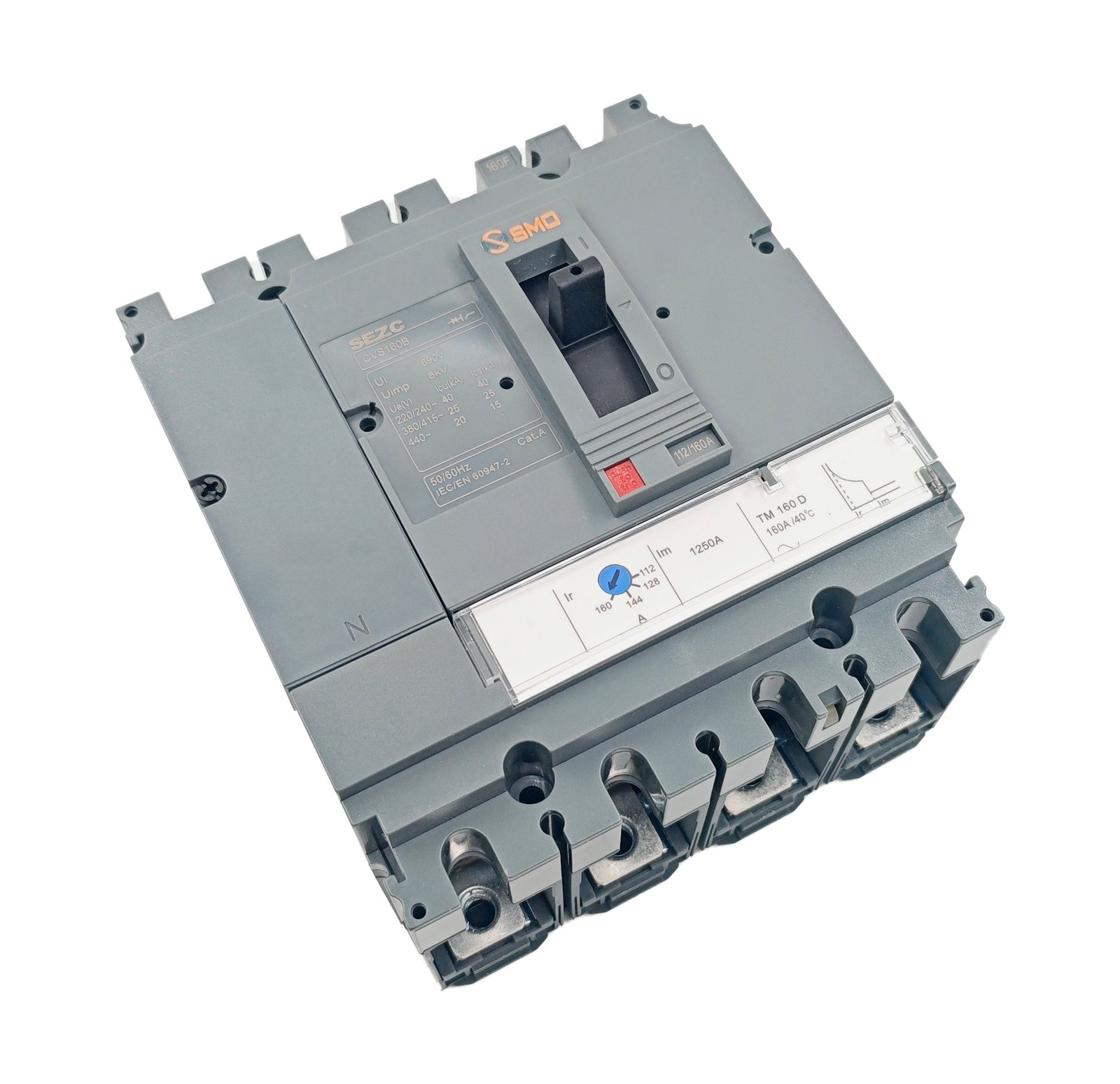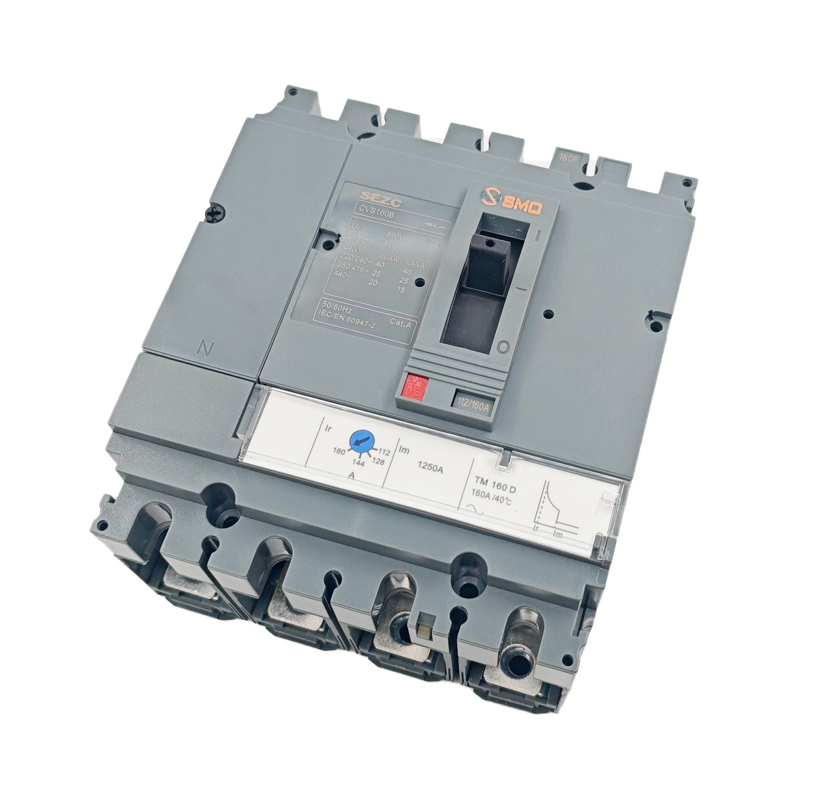 This CVS Series, 4P, 160A molded case circuit breaker is a professional low-voltage power distribution protection device with a rated current of 160A and 4P, widely used in industrial, construction and power distribution systems. It features a mature and stable design, strong versatility, high breaking capacity, and compact structure for easy installation and maintenance. Its core function is to quickly disconnect the circuit in case of overload or short circuit, effectively protecting lines, equipment and personal safety, and ensuring stable and safe operation of the entire power distribution system.